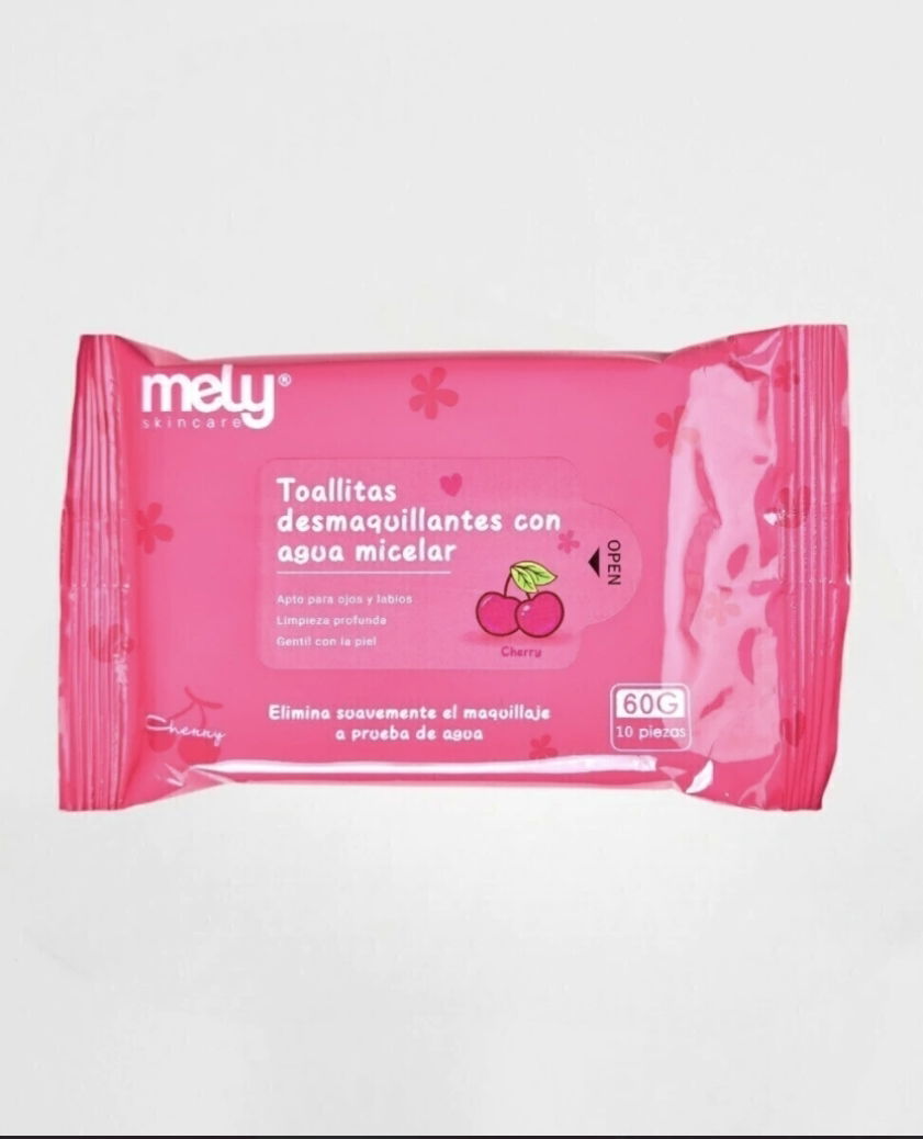 Elimina el maquillaje a prueba de agua con las toallitas Mely. Enriquecidas con agua micelar y aroma a cereza. Ideales para ojos y labios. ¡Piel limpia y fresca ya!